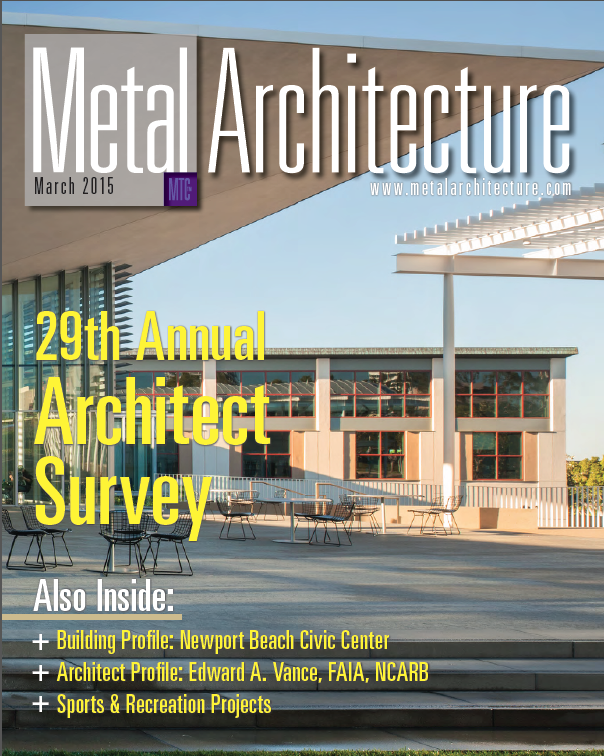 This is the March 2015 edition of Metal Architecture. Articles include: 29th Annual Architect Survey; Building Profile: Newport Beach Civic Center; Architect Profile: Edward A. Vance, FAIA, NCARB; and Sports & Recreation Projects. read more...